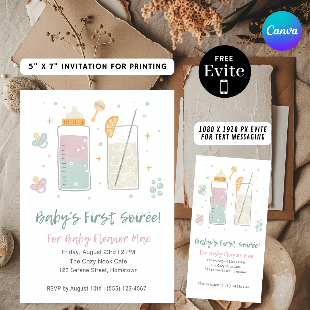 Baby's First Soirée Invitation Girl | Editable Bottles & Cocktails Template | Modern Sip and See Baby Shower Invite | Printable & Digital