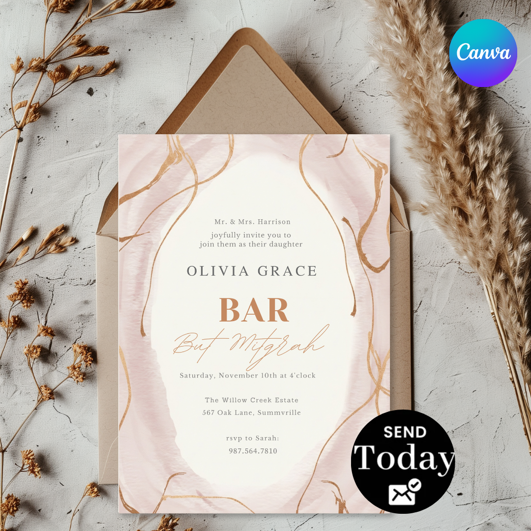 Bat Mitzvah Invitation Girl | Editable Template | Blush Pink and Rose Gold Invite | Modern Elegant Party | Printable Digital | Instant Download