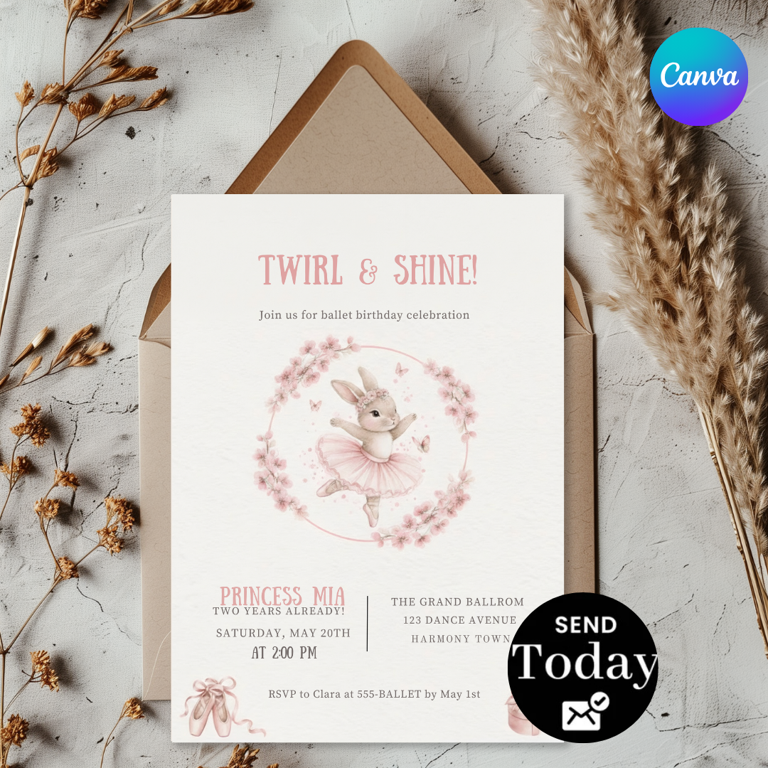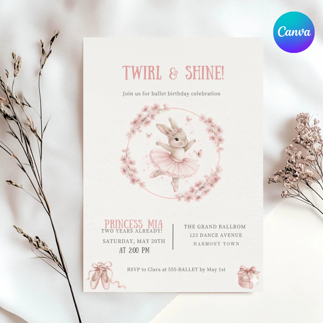 Bunny Ballerina Birthday Invitation | Girl's Third Birthday Invite Template | Editable Twirl & Shine Party | Printable Digital Instant Download