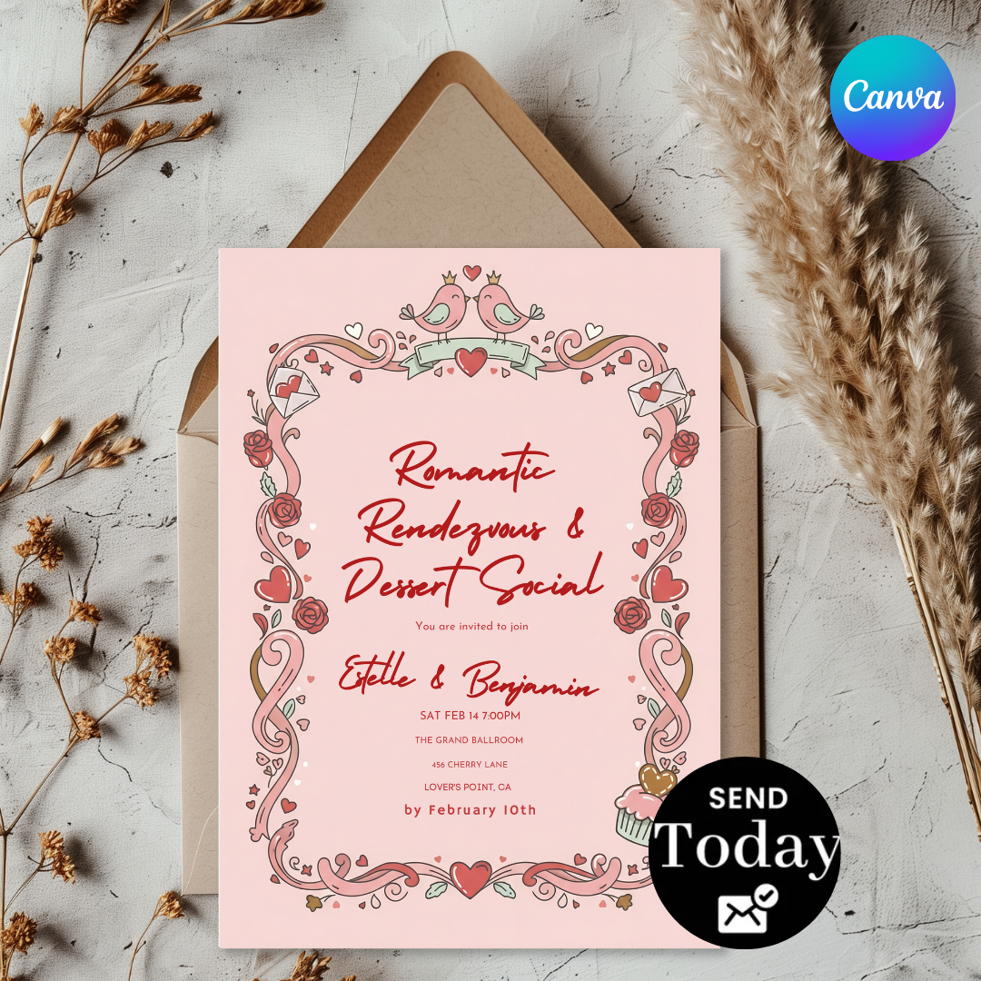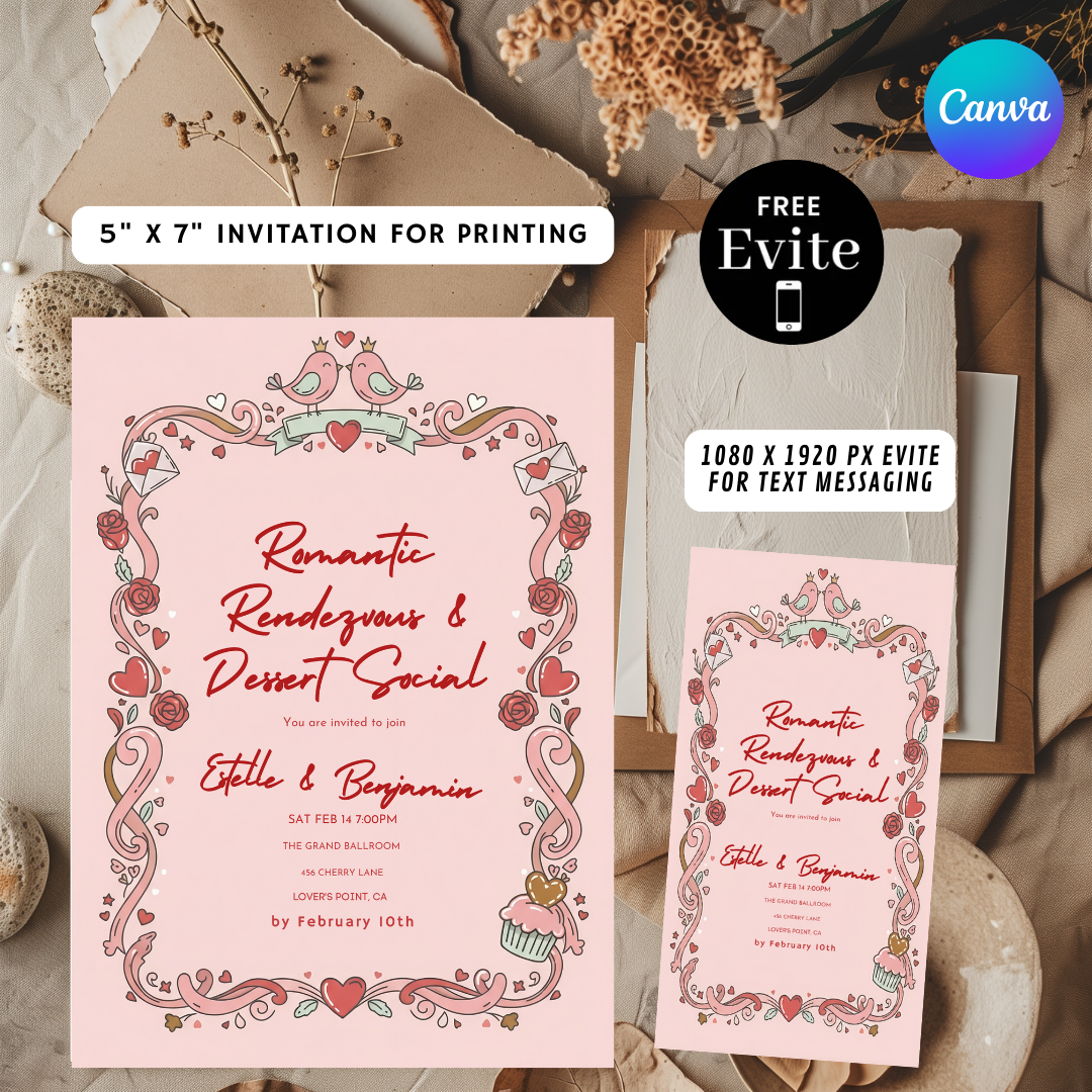 Editable Valentine's Day Invitation | Romantic Rendezvous & Dessert Social Template | Couples Party Invite | Love Birds Theme | Instant Download