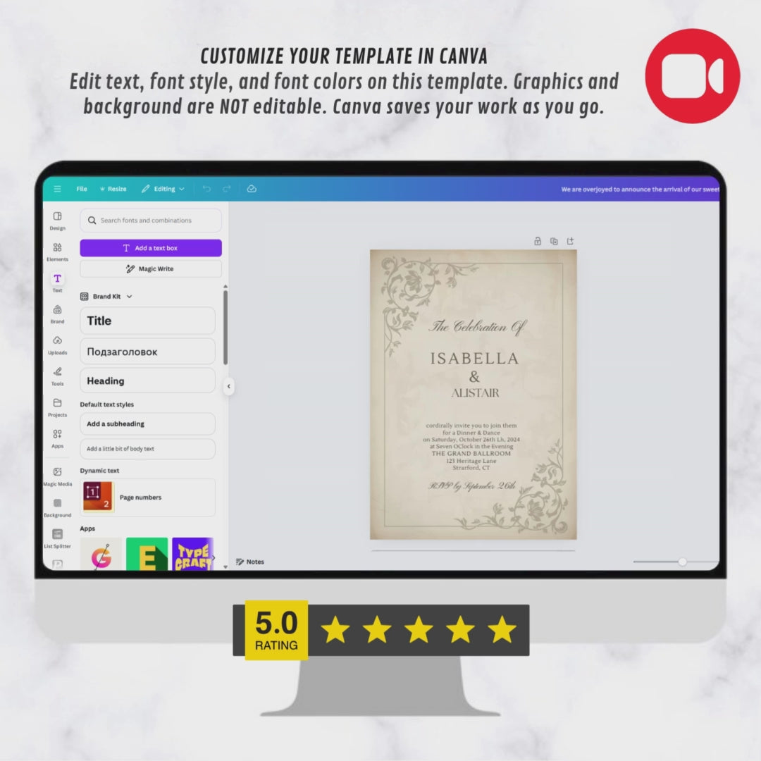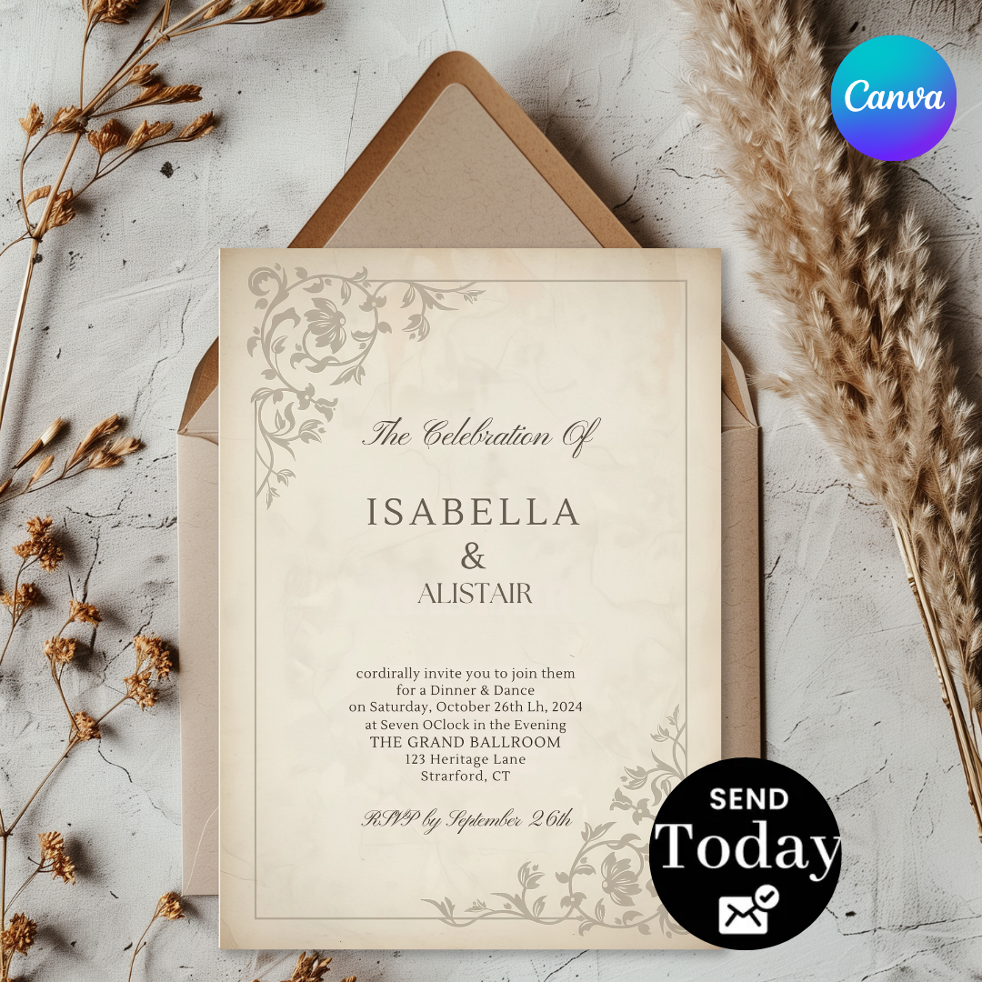 Elegant Wedding Invitation Template | Classic Vintage Invite | Editable Canva Printable | Formal Floral Wedding Suite | Instant Download Digital