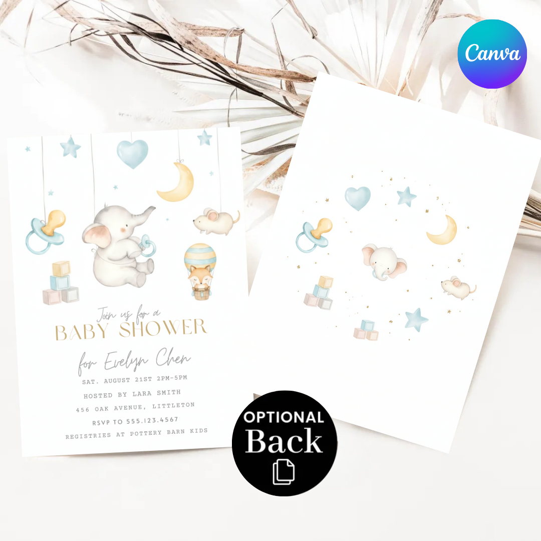 Elephant Baby Shower Invitation Boy or Girl | Editable Star & Moon Invite | Watercolor Animal Template | Printable Digital | Instant Download
