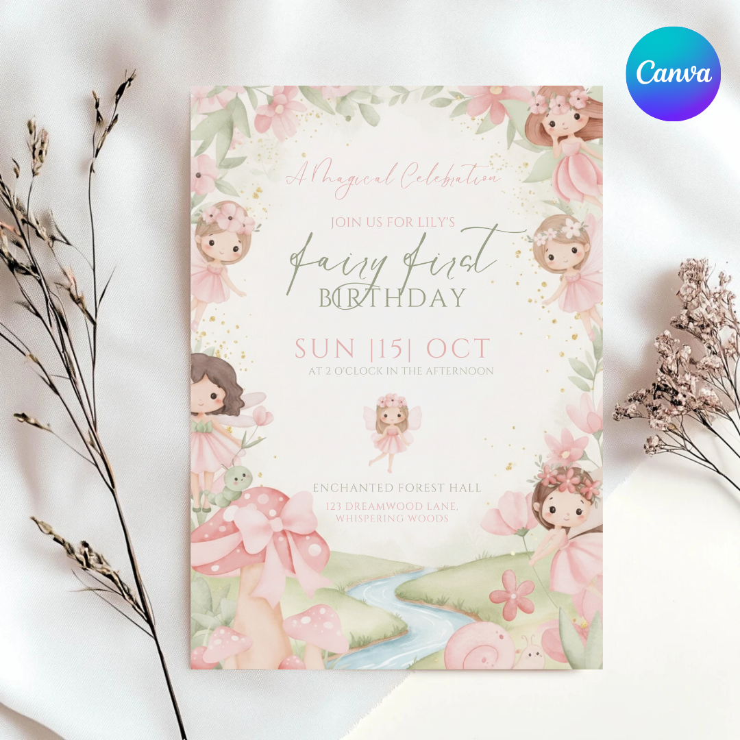 Fairy First Birthday Invitation Girl | Editable Enchanted Forest Invite | Magical 1st Birthday Party Template | Pink and Gold | Digital Evite