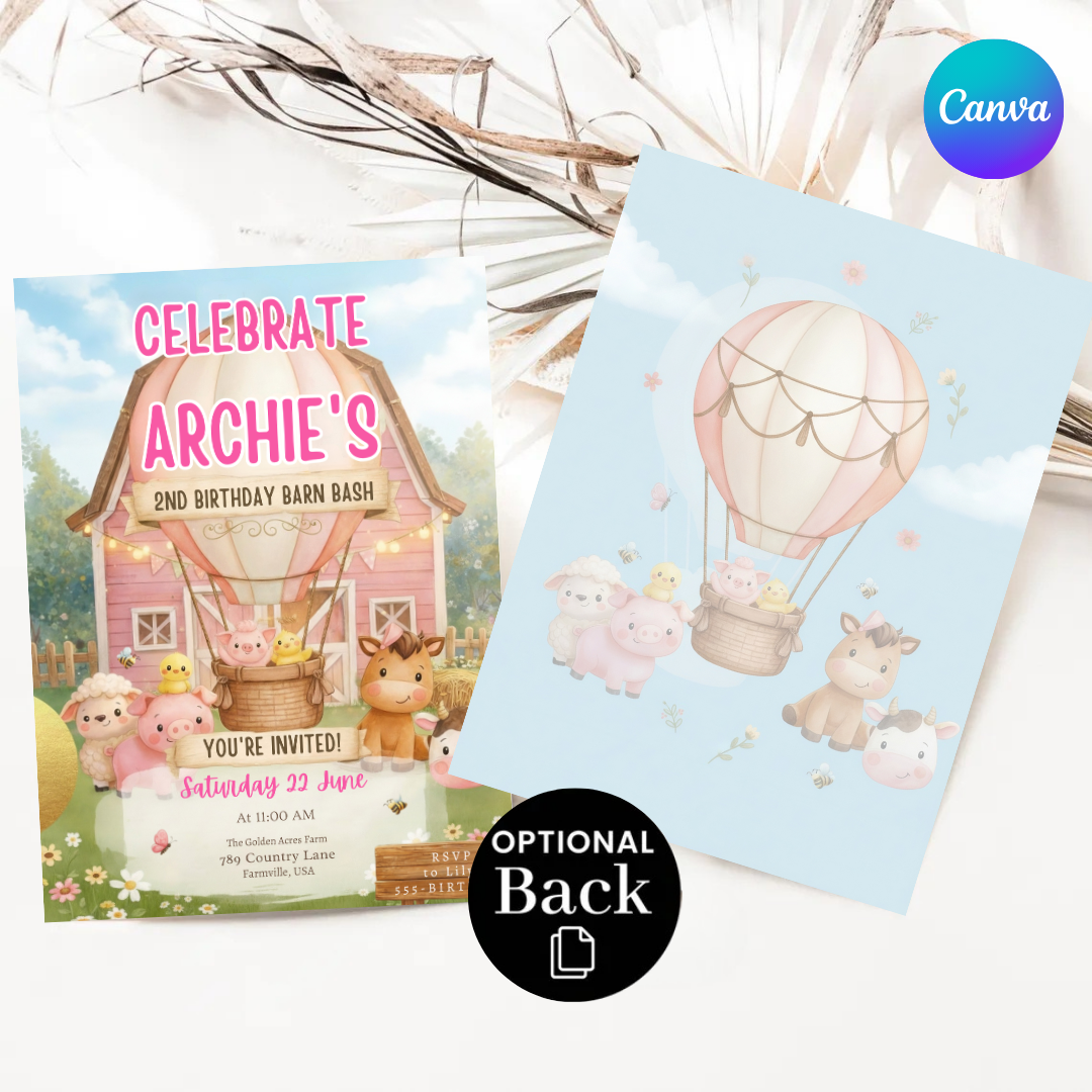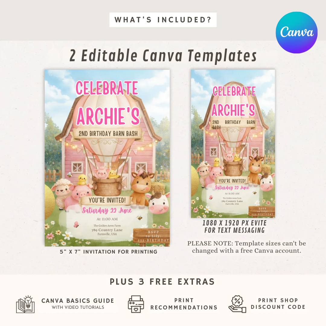 Farm Animal Birthday Invitation Girl | Editable Pink Barnyard Bash Template | Cute Farm Animals Party Invite | Second Birthday | Instant Download