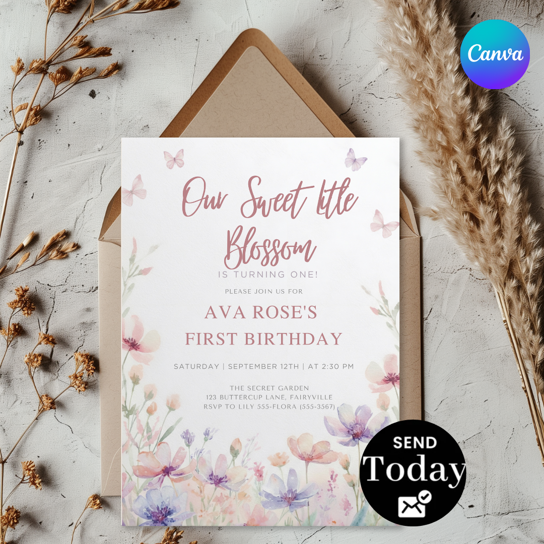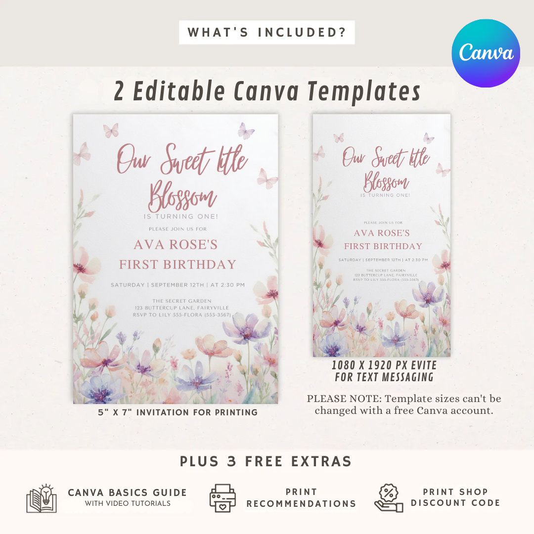 Girl's First Birthday Invitation | Editable Wildflower Garden Party Invite | Our Sweet Blossom Theme | Printable Template | Instant Download