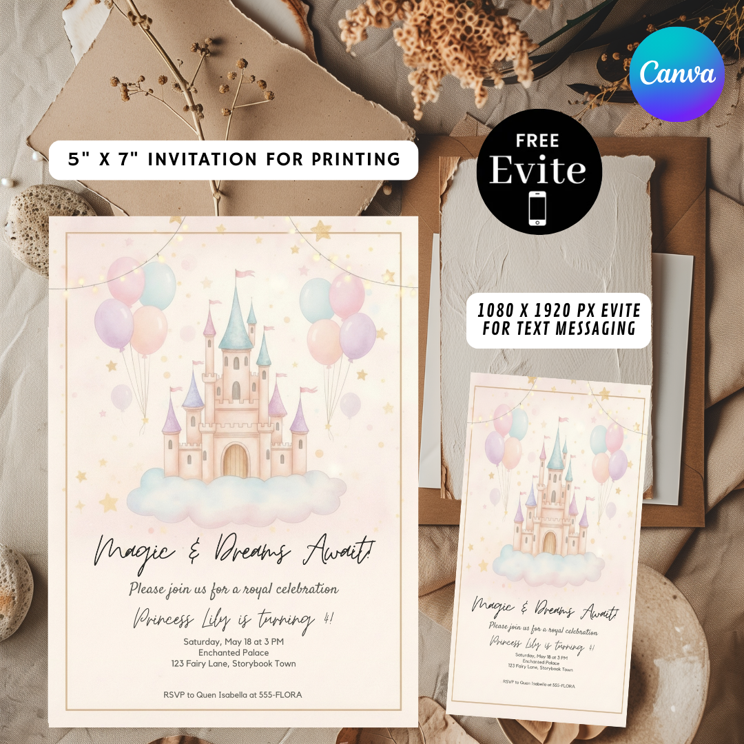 Princess Birthday Invitation | Editable Castle Invite Template | Girl's Royal Celebration | Whimsical Fairy Tale Party | Printable | Digital Evite